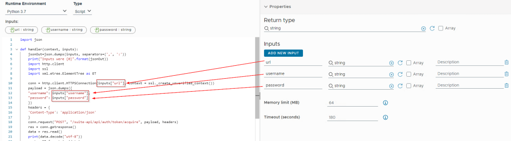 - Start fresh: Create a new action in Orchestrator with Runtime = Python 3.7. A default breadboard script will show up.